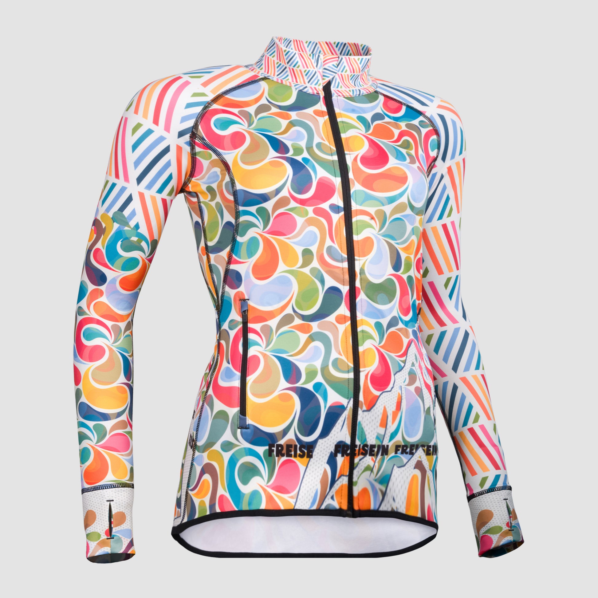 Farbenfroher Allover RetroPrint - bewusst passend für all Deine Berg und Freizeithosen von uns erarbeitet. Auf dem Vorder/ und Rückteil dezent eingearbeitete Bergkette - sichtbar auf den zweiten Blick. Die Jacke ist Teil unsere Herbstlinie mit passendem Shirt und Bergleggings.